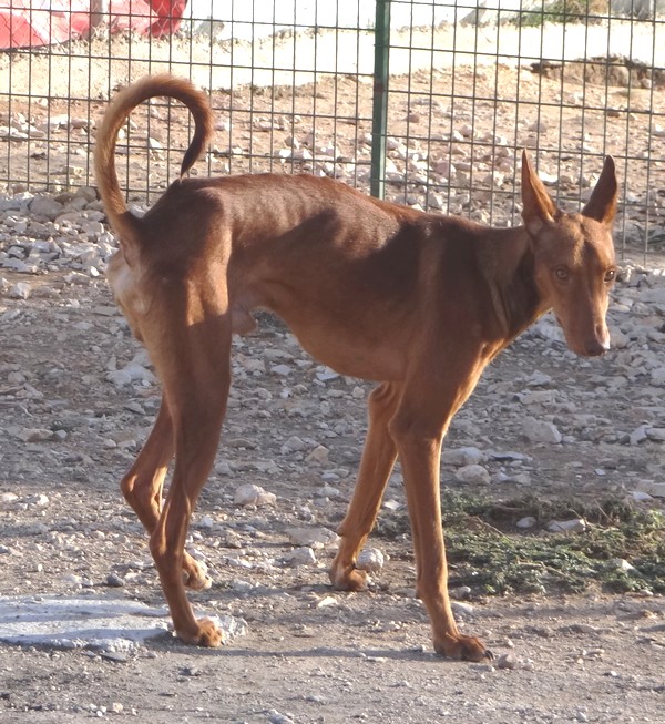 Nous avons reçu un SOS pour un podenco dans la région de Cadiz, abandonné dans une zone agricole et qui était en danger. Il s’approchait des fermes et les agriculteurs menaçaient de le tuer. Il était dans un tel état de maigreur que nous n’avons pas pu détourner les yeux.. Il est arrivé à Madrid à la pension le 6 nov dernier. C’est un jeune chien adorable, sans traumatisme, qui a juste besoin de se refaire une santé et qui va devenir un chien magnifique. C’est un podenco de 65cm, tout en finesse et au regard de miel.