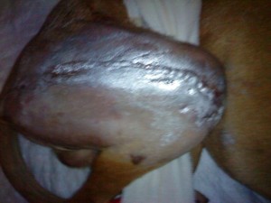 pauvre cheri!!! quelle balafre!! jespere quil ne souffre pas trop!!!!! milles bisous pour toi joli podenco!!!!