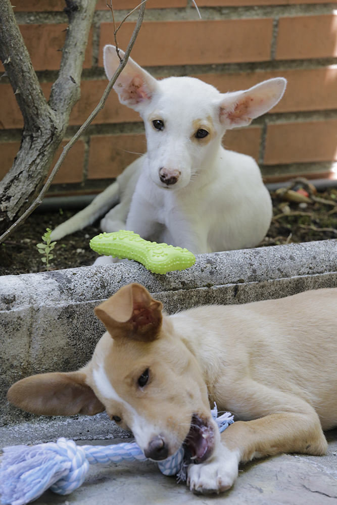 Mariposa est la petite femelle blanche et Apache le petit male marron. Les personnes de la perrera nous ont dit qu’ils étaient de la meme portée, mais nous n’en avons pas la certitude. Pour le moment, nous restons toujours réservés car nous ne savons pas comment les choses pourraient tourner encore d’ici quelques jours. On croise les doigts pour qu’ils puissent se remettre complétement. Une chose est sure, nous leur avons au moins offert un avenir, car à la perrera ils seraient morts.