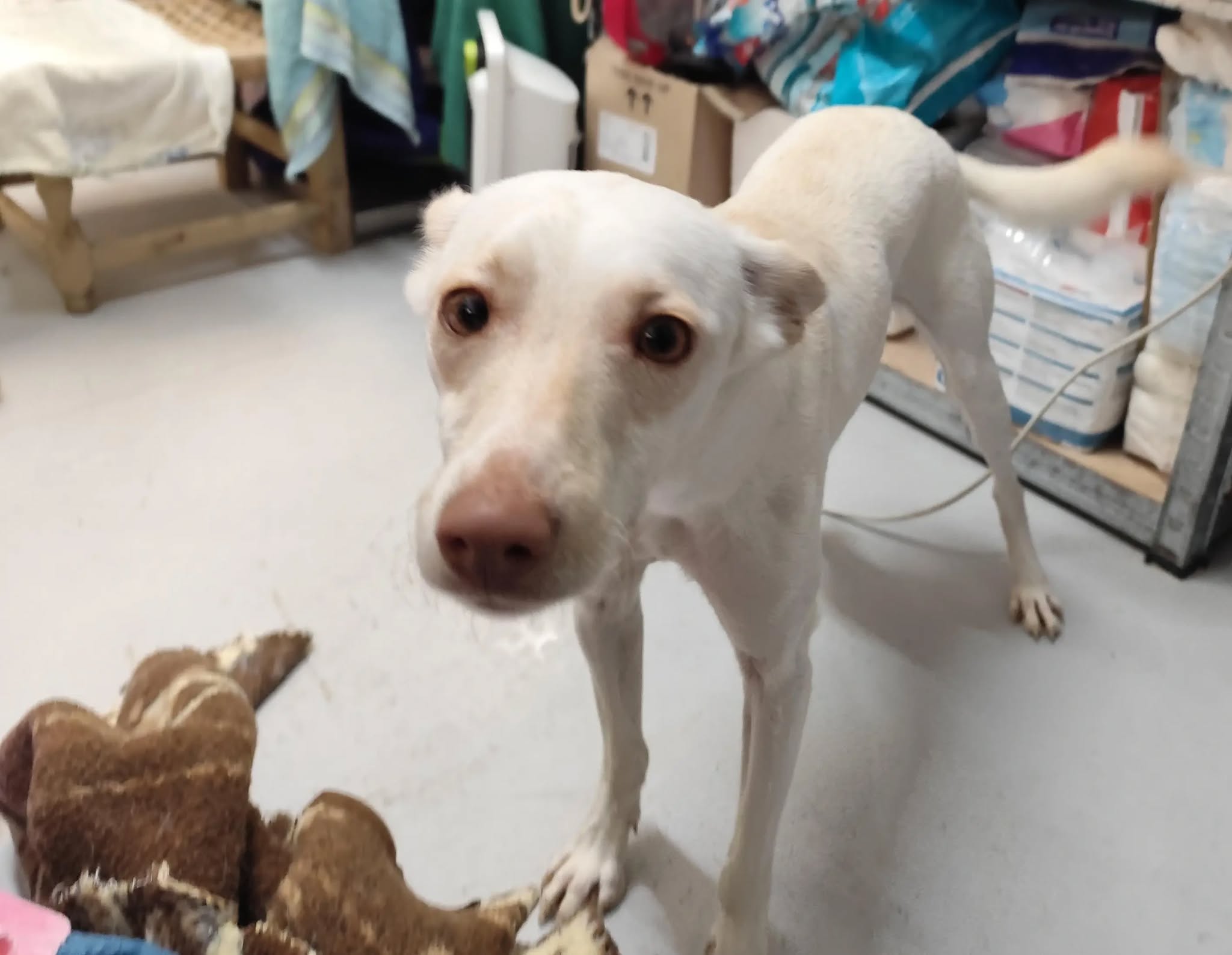 Toffee est d’une maigreur impressionnante mais il ne garde pas de rancoeur sur les mauvais traitements qu’il a reçu toute sa petite vie. La région de Alméria est le lot de ces pauvres podencos en masse trainant dans les rues maltraités et abandonnés dont les associations ne veulent pas.