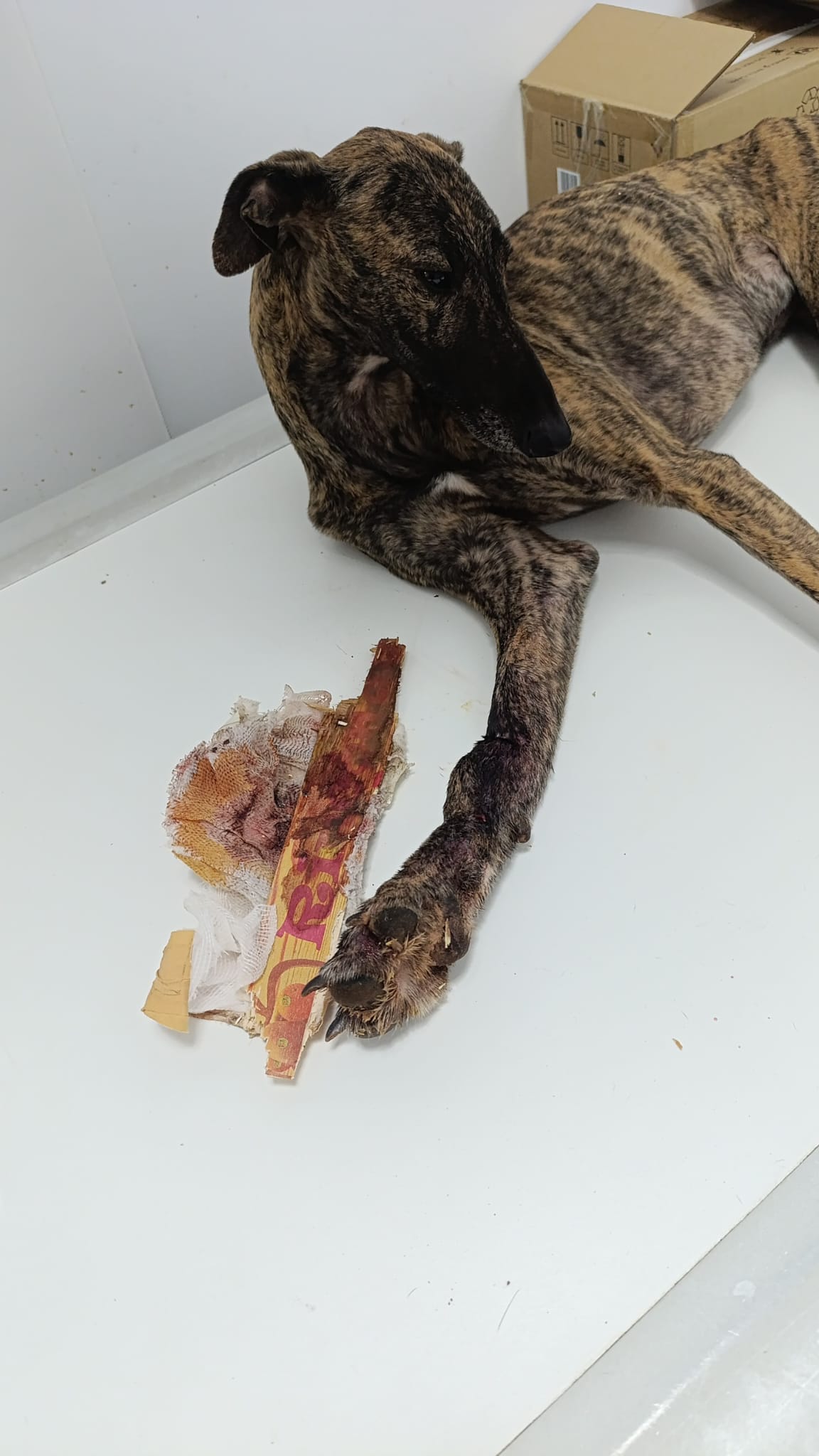 Malheureusement une de ces pattes est cassée , fracture ouverte. Il a fallu trouver une clinique calée pour une opération urgente. En attendant Janis souffre et hurle de douleur.