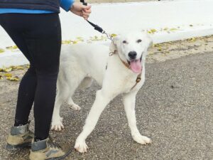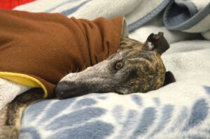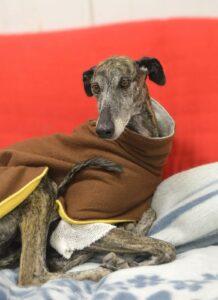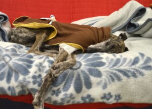 La toute petite Lina la seule non lévrier adoptée se fait attaquée au refuge et elle attend son transport à l’infirmerie.