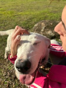Nous n’osons imaginer ce qu’a été son passé. Pourtant, nous connaissons bien les méthodes des galgueros, ces chasseurs qui considèrent leurs chiens comme de simples outils. Bounty n’était pas « utile », un être imparfait dans leurs yeux dénués de compassion. Avait-il été frappé pour être chassé ? Avait-il fui, échappant de justesse à une sentence fatale ? Son corps porte encore les traces d’un passé brutal : des séquelles neurologiques légères, sans doute le résultat de coups infligés. Pourtant, il avance, maladroitement mais avec la force des survivants.